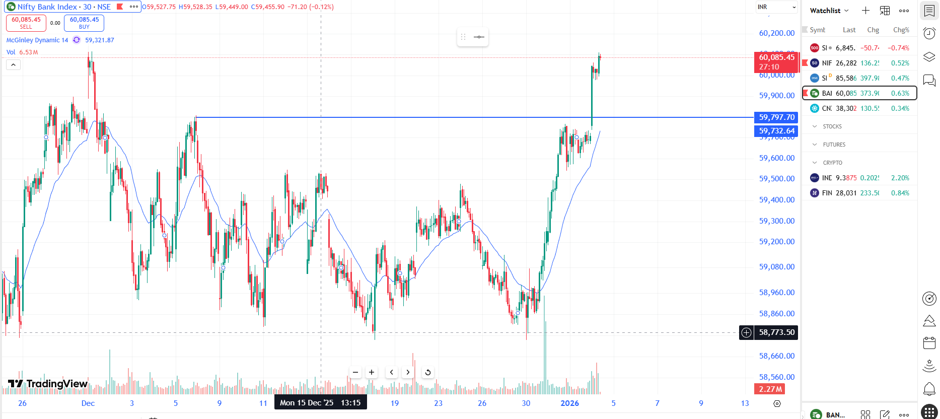 Bank Nifty is trading around the 59,700 level on 2 January 2026, moving in a narrow intraday range as the index consolidates near recent highs. While short-term momentum remains subdued, strong support from private sector banks is helping maintain a neutral to mildly bullish outlook.